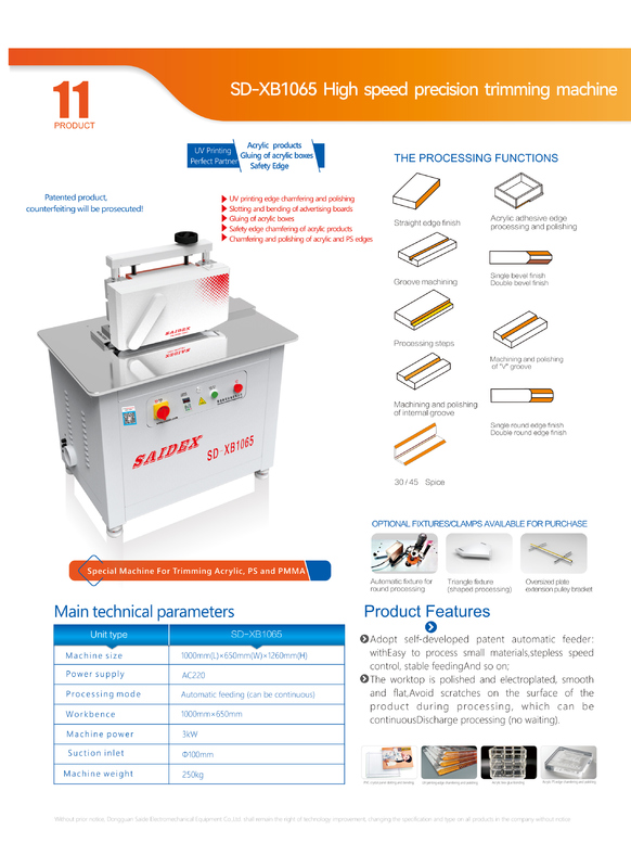 SAIDE Edge Chamfering Machine is an acrylic trimming machine which is designed to edge beveling equipment and trim acrylic edges. It is a powerful, yet compact machine which is easy to use and maintain. This machine has a battery capacity of 3AH and is powered by a 220V/50HZ voltage and rated voltage of 220V. It is highly reliable and comes with a one year warranty so you can be sure of long lasting performance. With its adjustable speed and precision, it is ideal for any kind of acrylic trimming needs. The SAIDE Edge Chamfering Machine will provide you with the perfect finishing touch for all your acrylic edge trimming needs.